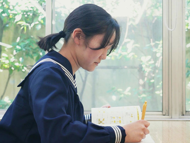 S・H英語の授業です。中学時代、先生が海外の漫画を紹介してくださって以来、ずっと好きな科目でした。リベラルアーツコースは文理問わずさまざまな授業を受けられるのですが、学んでみて一番楽しかったのはやはり英語。自分の志向を確認できるよい機会になりました。また、コース特有の学びとして、1年生で書道や音楽、裁縫などを学ぶ授業もあり、「こんな経験もできるんだ」と印象に残っています。
