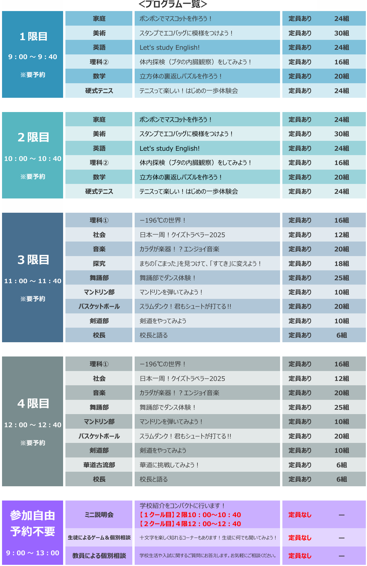 その他、「ミニ説明会」「教員・生徒による校内案内・個別相談」は予約不要・入退場自由となっております。