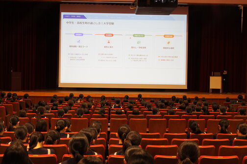 12月16日(月)、本校卒業生の石川みくりさん(国立研究開発法人 科学技術振興機構 職員)をお迎えし、中学3年生と高校2年生を対象に、進路や将来について考える「卒業生講演会」を開催しました。