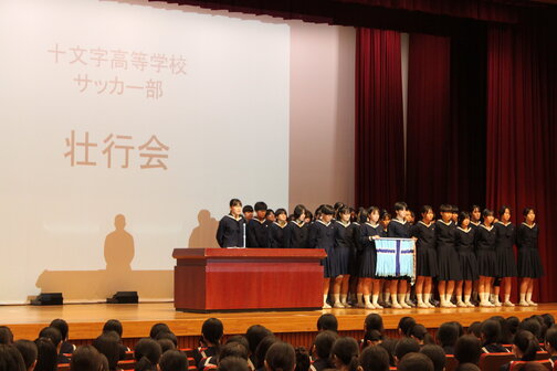 終業式後には部活動等の表彰伝達式が行われ、日頃の努力と成果が称えられました。続いて、「第34回全日本高等学校女子サッカー選手権大会」に出場を決めた、サッカー部の壮行会が行われ、代表者から大会に向けての決意が語られ、中央委員や校長からも激励の言葉が送られました。挑戦し続けることの大切さを改めて感じる一日となりました。