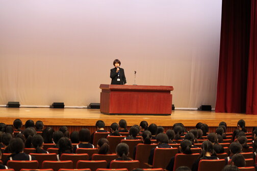 続いて副校長からは、ハラスメントやモラルについての話がありました。困ったことがあれば相談できる親や友人、そして先生がいること、相談することは決して弱いことではないということ、直接話しづらい場合は、学校の投書箱なども活用しながら、問題を早めに解決していくことの大切さについてもお話がありました。生徒が安心して学校生活を送れるよう、皆で学校づくりをしていきたいという思いが語られました。