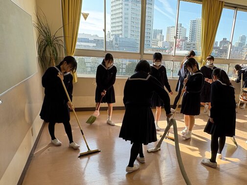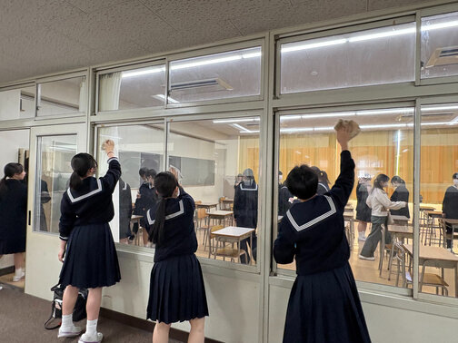 受験生の皆さんに気持ちよく試験を受けていただけるよう、皆で協力して教室・廊下の窓や床を心を込めて清掃しました。