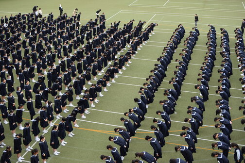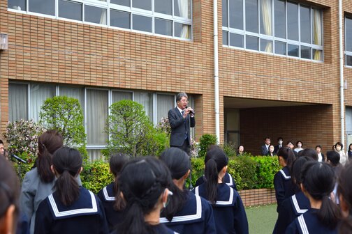 全校生徒が校庭に集まり、在校生と新入生が初めて顔を合わせました!