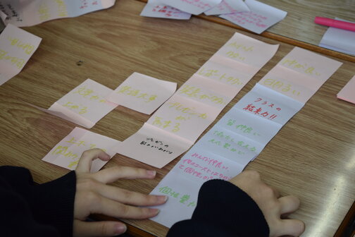 「自己発信コースといえば」等をテーマにブレインストーミングを行い、付箋を使って意見を出し合いながら、話し合い・発表へとつなげました。