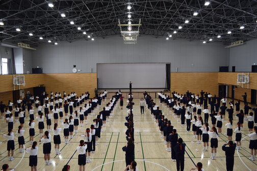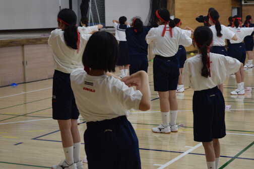 学年ごとに体育館に集まり、自彊術の動作を確認しました!創立以来、毎朝行う取り組みです♪心と体を整える大切な時間。