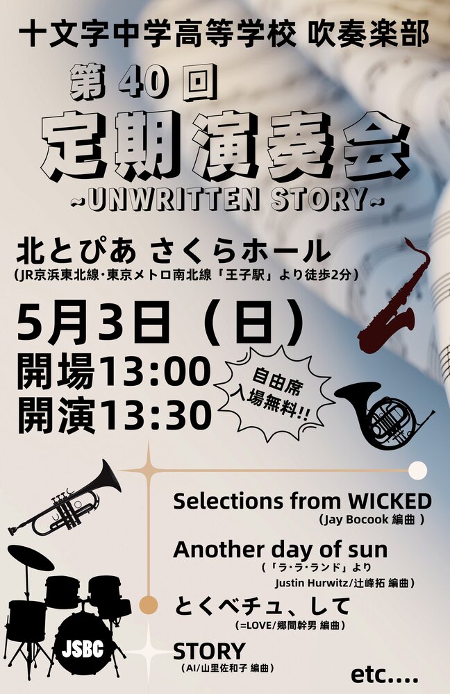 5月3日(日)、北とぴあ・さくらホールにて、吹奏楽部の定期演奏会を開催します!