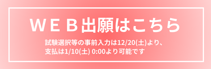 2025.12.01 出願サイトを公開しました。試験選択等の事前入力は12/20(土)より、支払は1/10(土) 0:00より可能です